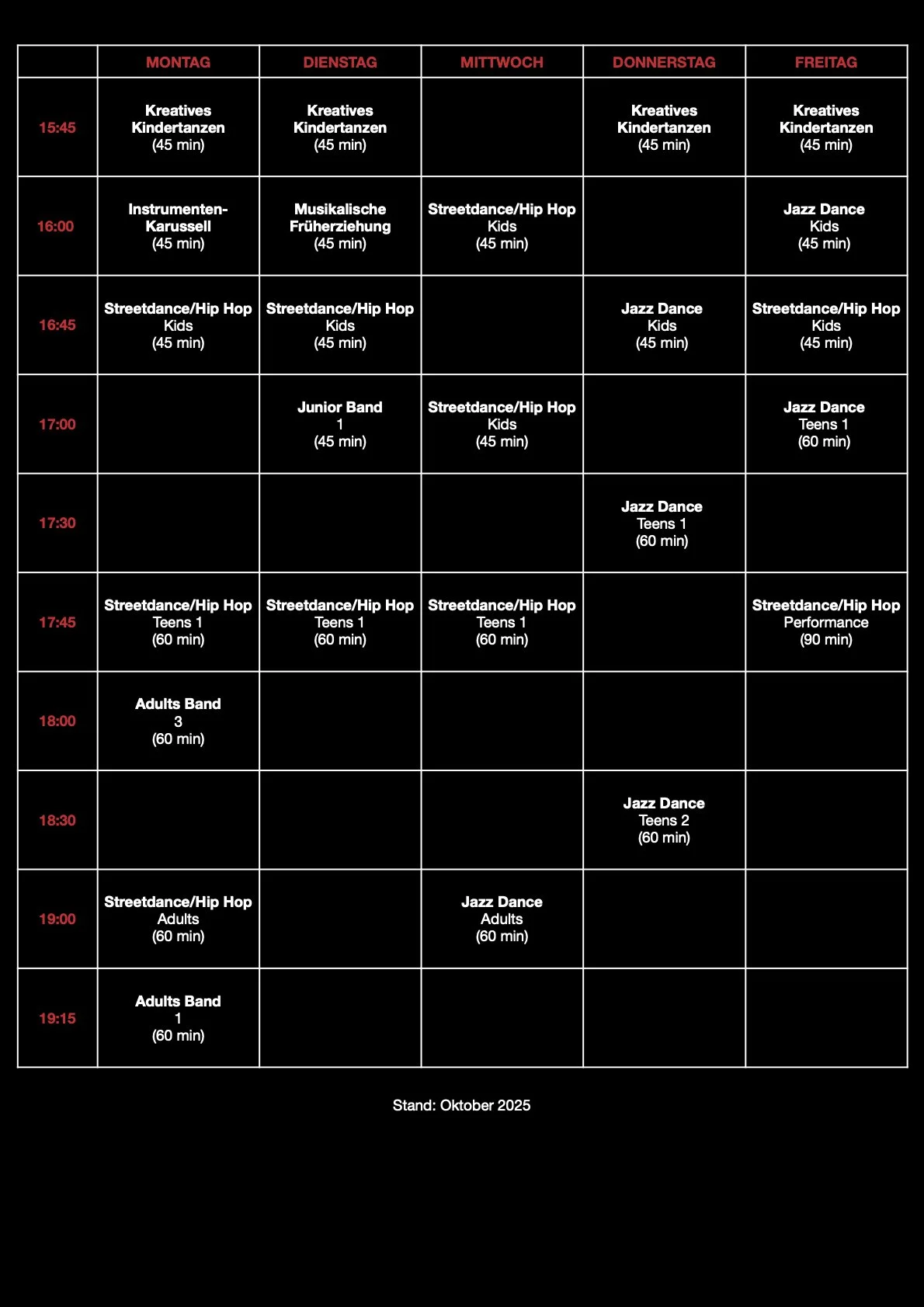 Spezialisiert auf moderne Musikrichtungen und Tanzstile, verschreibt die Schule sich der gezielten Förderung von Kindern und Jugendlichen sowie der musikalischen/tänzerischen Erwachsenenbildung. Anfängern bietet sie eine Grundlagenausbildung, Fortgeschrittenen die Möglichkeit zur intensiven Ausbildung und ein breitgefächertes Angebot, um alle musikalischen und tänzerischen Interessen zu bedienen.